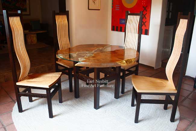 These custom made dining tables are designed to be eye-catching fine art furniture. They are also made to be used and enjoyed. Each table was handcrafted using the highest quality materials and the finest craftsmanship. Click on a photo to open another webpage with a description of each of the dining tables. Earl has been designing and building custom made furniture professionally for more than 30 years. We sell Earl's furniture exclusively online through this website and at juried shows. Our studio is open by appointment only. Call for hours. We deliver and install to locations around the country. We ship Earl's custom made furniture worldwide.